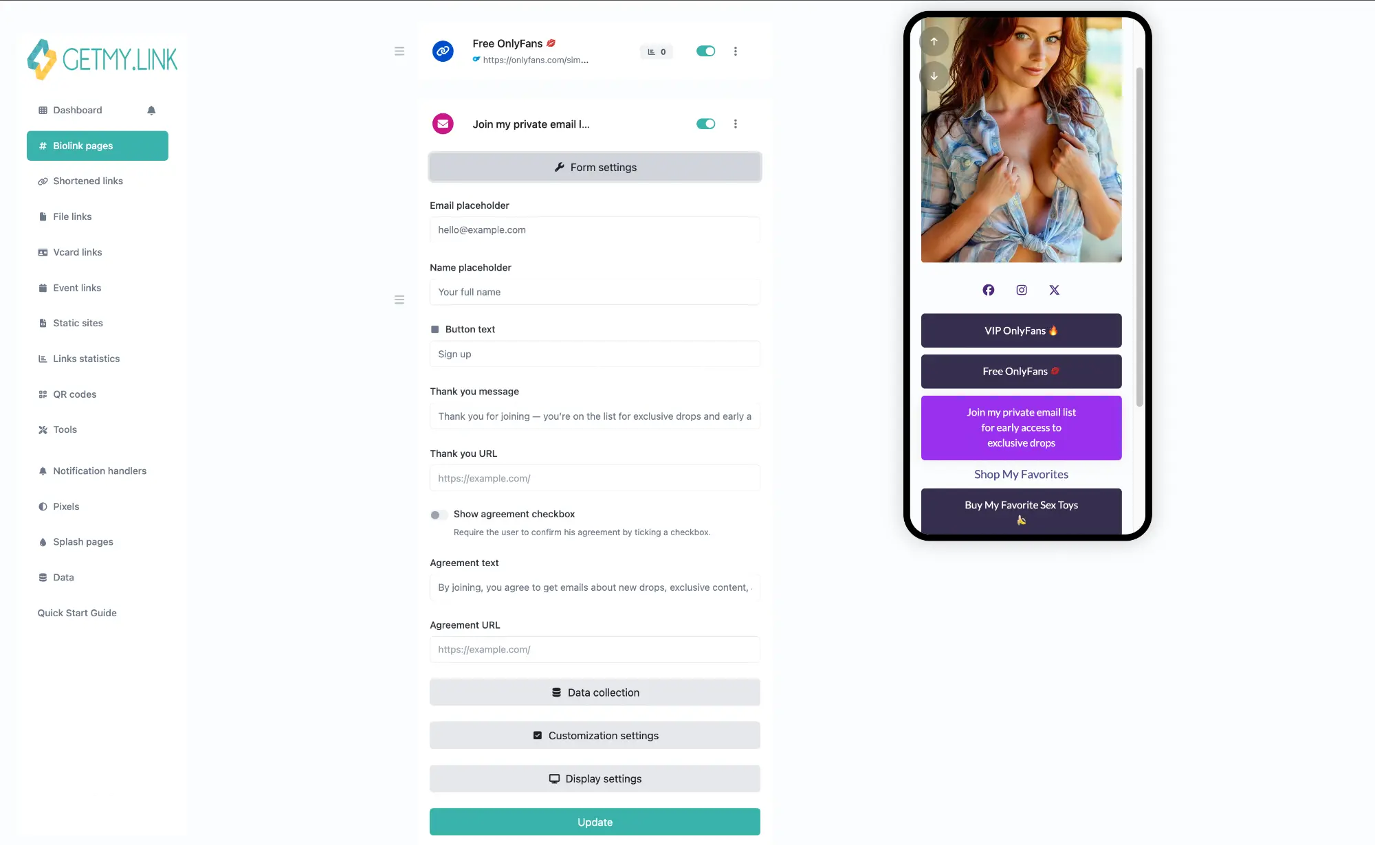 For creators, this is the point where GetMy.Link starts replacing the need for a website. The email form is already built into the page setup, so there is no need to embed a separate tool or send fans somewhere else just to leave their address. Everything can happen in one place, which keeps the process cleaner and makes the page easier to manage.